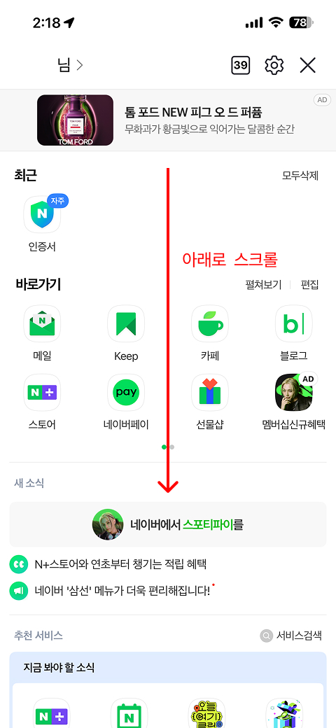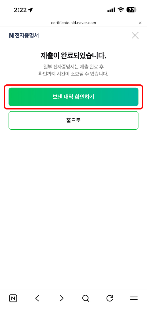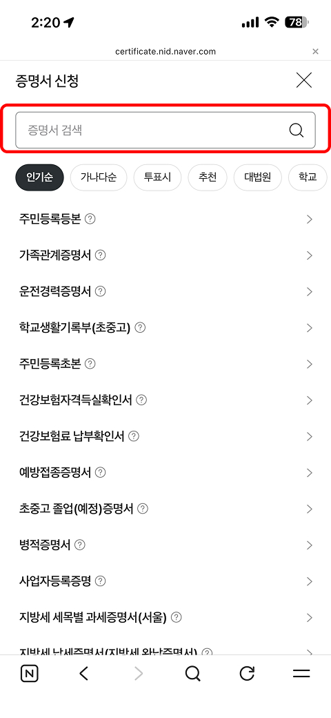 네이버 앱 실행 후 상단 더보기 에서 아래로 스크롤 후 → 인증서를 눌러주세요