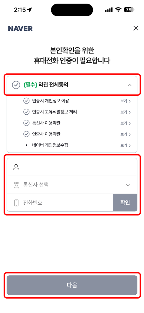인증서 발급을 위해 본인 명의 휴대폰 번호로 본인확인 진행