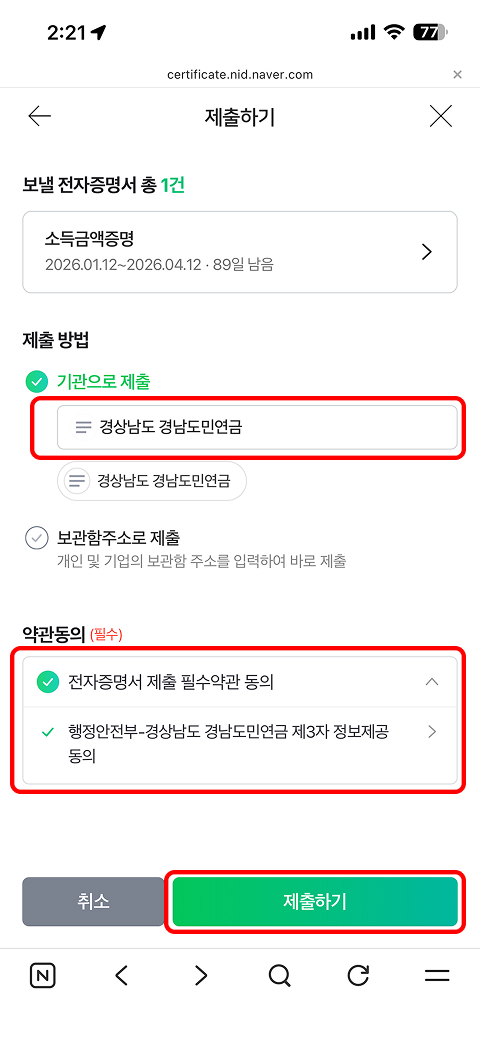 제출 기관 검색 → ‘경상남도 경남도민연금’ 제출 기관 선택 → 다음 → 이용약관 전체동의 → 완료