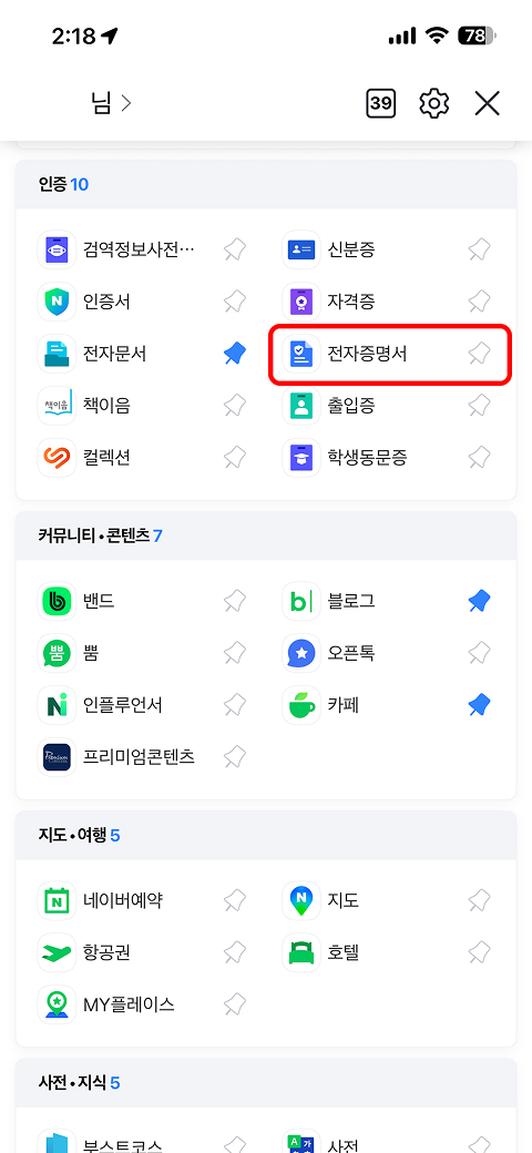 네이버 앱 실행 → (좌측 상단) 더보기 → 아래로 스크롤 후 → 전자증명서