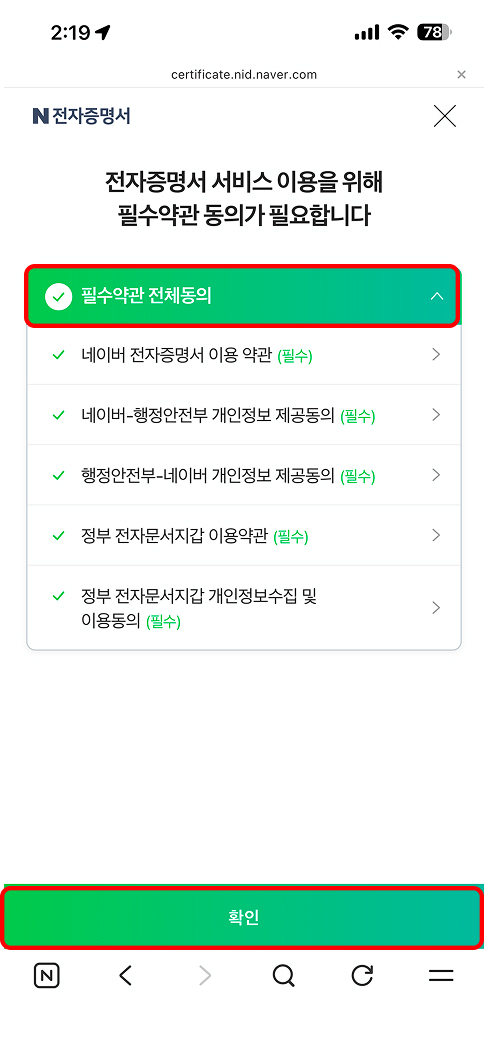 인증서 발급을 위한 이용약관 동의 후 → 계속 진행하기