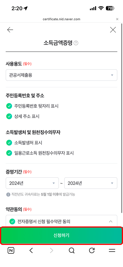 증명기간을 선택하고 발급내용을 모두 체크 후 [필수]제공동의 후 → 인증 후 신청하기
