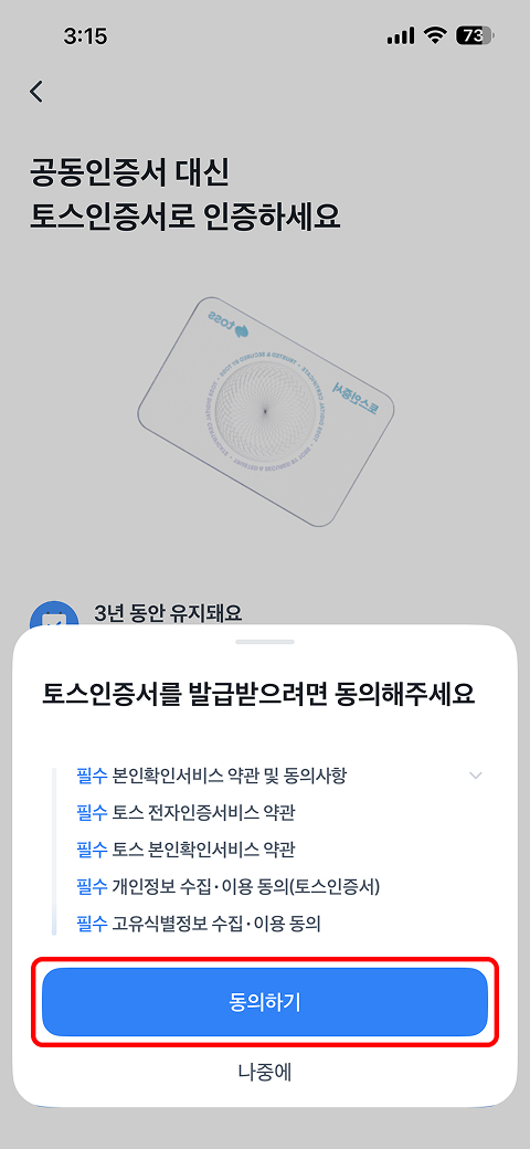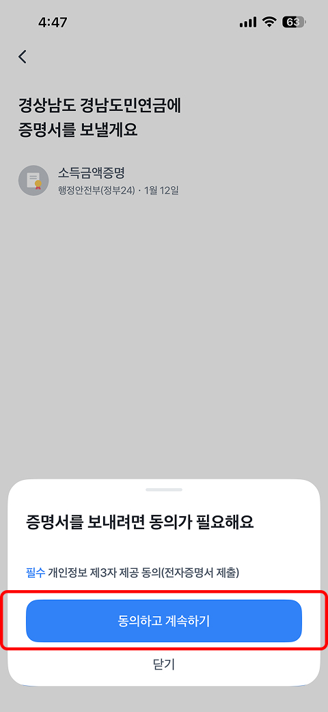 인증서 발급을 위한 이용약관 동의 후 → 계속 진행하기