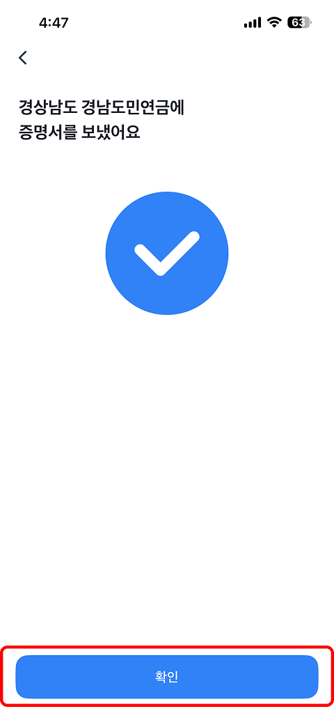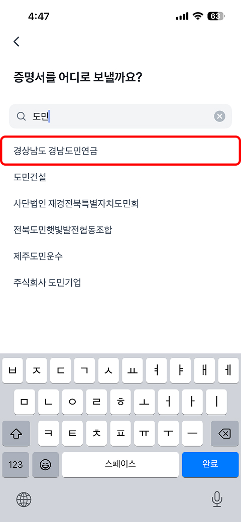 제출 기관 검색 → ‘경상남도 경남도민연금’ 제출 기관 선택 → 다음 → 이용약관 전체동의 → 완료