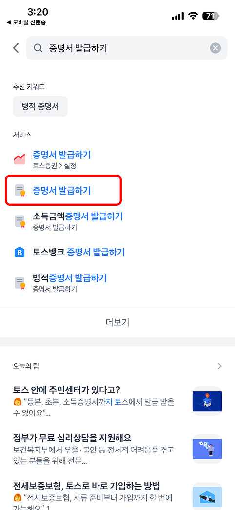 토스앱 실행 → (하단) 전체 → 검색(돋보기) 클릭 → 증명서발급하기 검색