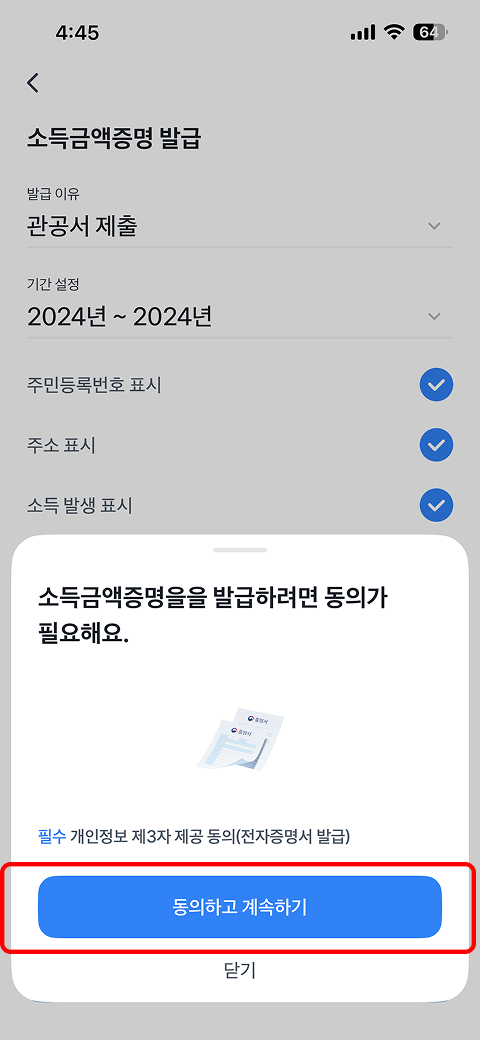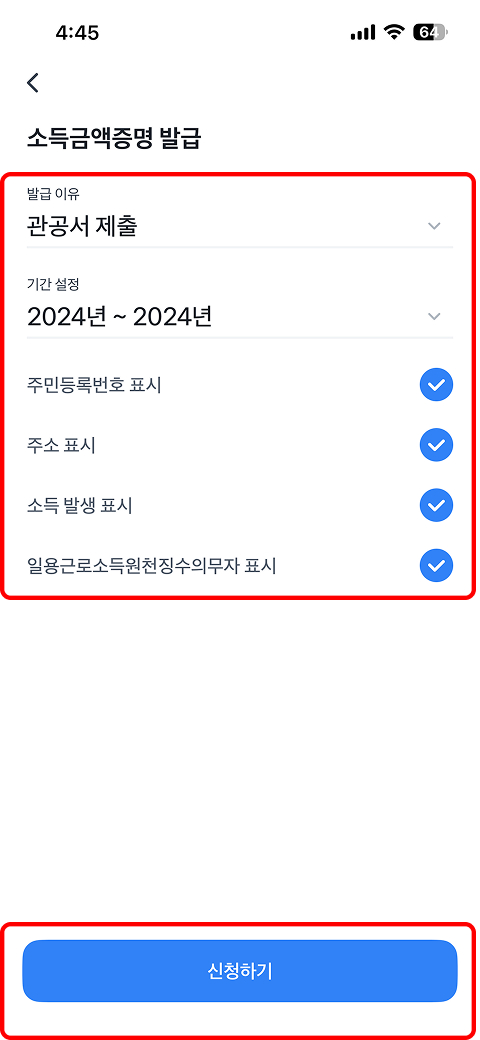 ※ 증명기간 : 소득금액증명은 2024년~2024년, 건강보험료 납부 확인서는 2025년 1월 ~ 12월 선택